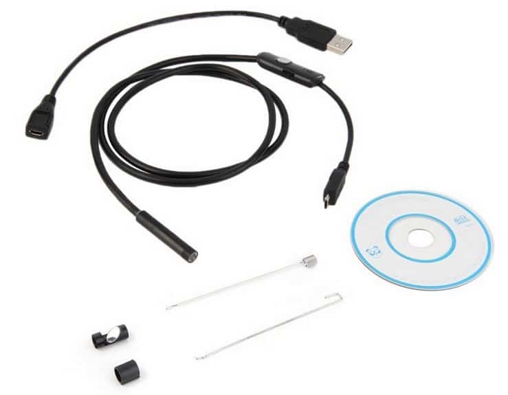 • Lieferumfang: Endoskopkamera 1 m, USB-/Micro-USB-Adapter, zwei Haken und Spiegel, CD, Anleitung.